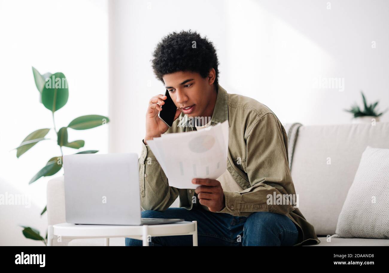 Serious Black Teen Guy Studying Online From Home Talking To His Tutor About Coursework Paper On Smartphone Stock Photo Alamy
